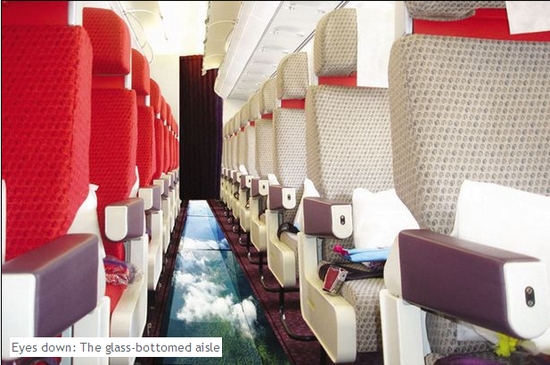 據英國《每日鏡報》4月1日報道,為了讓乘客真正體會(huì )在空中旅行的感覺(jué),英國維珍航空公司推出的新式噴氣機安裝有玻璃地板,讓飛行途中的乘客低頭便可將天空一覽無(wú)遺,真正體會(huì )“在空中行走”的感受。