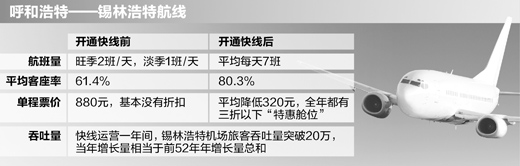 實(shí)施快線(xiàn)前,呼錫線(xiàn)上的機票基本沒(méi)有折扣,單程票價(jià)為880元?炀(xiàn)實(shí)施后,該航線(xiàn)每張票平均降低了320元,并且全年都有三折以下的“特惠艙位”。