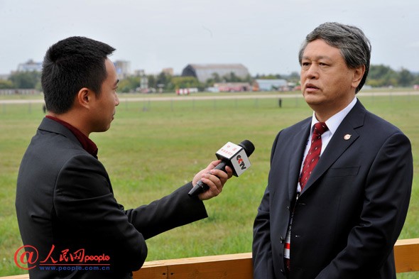 2013年8月27日上午,中國航空技術(shù)國際控股有限公司董事長(cháng)馬福安(右)在第11屆莫斯科航展上接受中央電視臺記者采訪(fǎng)。 攝影:人民網(wǎng) 楊鐵虎