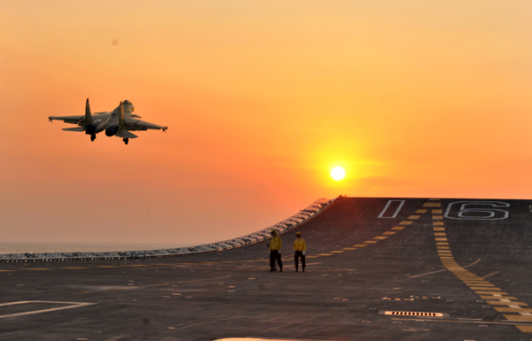 9月15日,殲—15艦載戰斗機成功完成最大重量起降試驗。圖為觸艦復飛的殲—15艦載戰斗機! 垊P攝