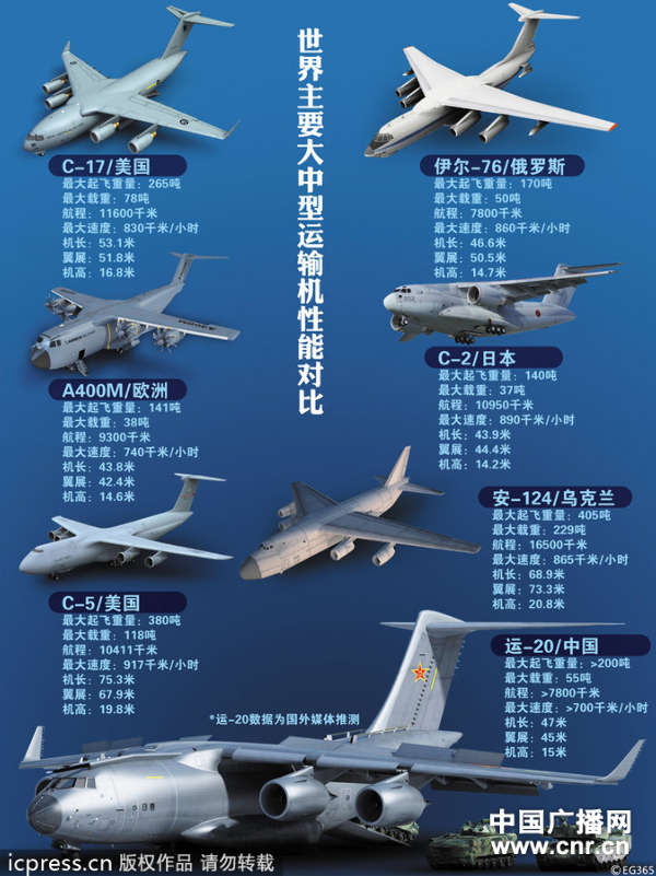 “運-20”,機體長(cháng)47米,翼展45米,高15米,實(shí)用升限是13000米,最高載重量是66噸,最大起飛重量220噸,因此躋身全球十大運力最強運輸機之列!斑\-20”的首次飛意味著(zhù)中國空軍向戰略空軍邁出了堅實(shí)的一步。