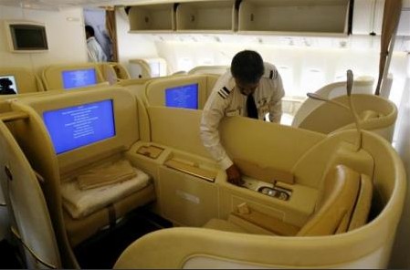 波音777-200環(huán)球客機頭等艙座椅寬敞,調節幅度大,座位前安裝大屏幕電視。