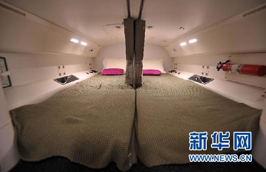 這是飛機內的機組人員休息室(12月9日攝)。 12月9日,波音787“夢(mèng)想”飛機飛抵?诿捞m國際機場(chǎng),開(kāi)始為期2天的全球巡展?谡净顒(dòng)。此前波音公司于12月4日在北京啟動(dòng)了787飛機全球巡展“夢(mèng)想之旅”,之后將于11日飛赴非洲。波音787可搭載乘客210至250名,航程達14200至15200千米,飛行速度0.85馬赫。 新華社記者 郭程攝