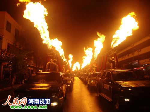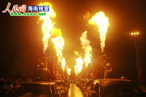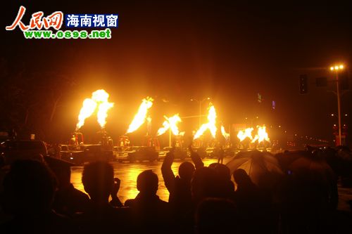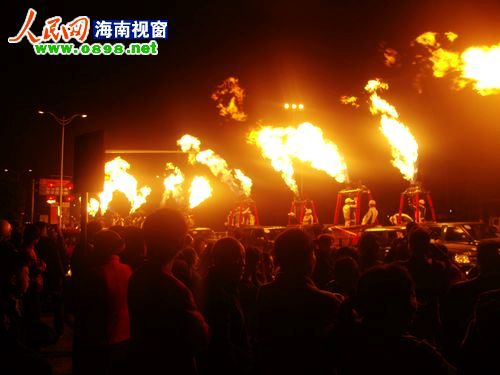 26日晚8點(diǎn)左右,2011環(huán)海南島飛行拉力賽萬(wàn)寧段的首場(chǎng)活動(dòng)——熱氣球噴火表演游行在萬(wàn)寧市區上演。當晚,萬(wàn)寧市區飄起了毛毛細雨,20個(gè)熱氣球組成的方陣從萬(wàn)寧市人民中路與萬(wàn)州大道交叉路口出發(fā),以人民公園為終點(diǎn)。在充滿(mǎn)動(dòng)感的音樂(lè )聲中,熱氣球進(jìn)行了多種樣式的噴火表演,交叉噴射,雙向噴射,搖擺噴射……整齊劃一的火柱照亮了萬(wàn)寧的夜空,熾熱耀眼的火焰蒸發(fā)了綿綿的細雨。眾多萬(wàn)寧市民早早守候在萬(wàn)州大道兩旁,欣賞這難得一見(jiàn)的場(chǎng)景。方陣經(jīng)過(guò)的每個(gè)地方都引起尖叫聲一片,整條街道歡樂(lè )的氣氛達到了沸點(diǎn)。