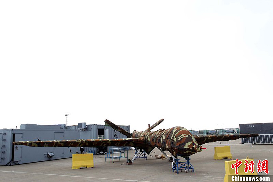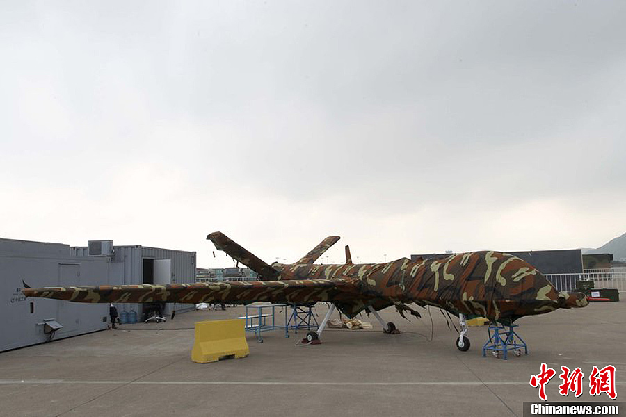 曾在前兩屆珠海航展上展出模型的翼龍無(wú)人機,在今年航展上以實(shí)物參展。11月8日,該機已經(jīng)組裝完畢停放在展坪上。該款無(wú)人機由中航工業(yè)旗下成都飛機設計研究所研制,該機裝有一臺100馬力活塞發(fā)動(dòng)機,具備全自主平輪式起降和飛行能力,最大起飛重量達1100公斤,最大續航時(shí)間為20個(gè)小時(shí),可攜帶各種偵察、激光照射/測距、電子對抗設備及小型空地打擊武器,可執行監視、偵查及對地攻擊任務(wù)等任務(wù),也可用于維穩、反恐、邊界巡邏等。