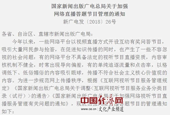 國家新聞出版廣電總局關(guān)于加強網(wǎng)絡(luò )直播答題節目管理的通知