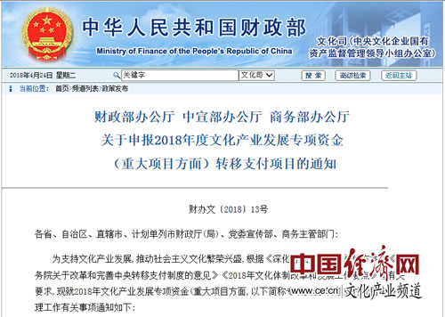 通知說(shuō)明,為支持文化產(chǎn)業(yè)發(fā)展,推動(dòng)社會(huì )主義文化繁榮興盛,根據《深化財稅體制改革總體方案》《國務(wù)院關(guān)于改革和完善中央轉移支付制度的意見(jiàn)》《2018年文化體制改革和發(fā)展工作要點(diǎn)》等有關(guān)要求,財政部、中宣部和商務(wù)部聯(lián)合管理2018年文化產(chǎn)業(yè)發(fā)展專(zhuān)項資金(重大項目方面,以下簡(jiǎn)稱(chēng)專(zhuān)項資金)轉移支付項目申報工作。