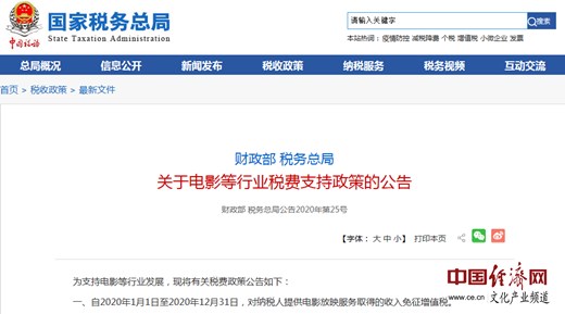 稅務(wù)總局:電影等行業(yè)2020年文化事業(yè)建設費免征