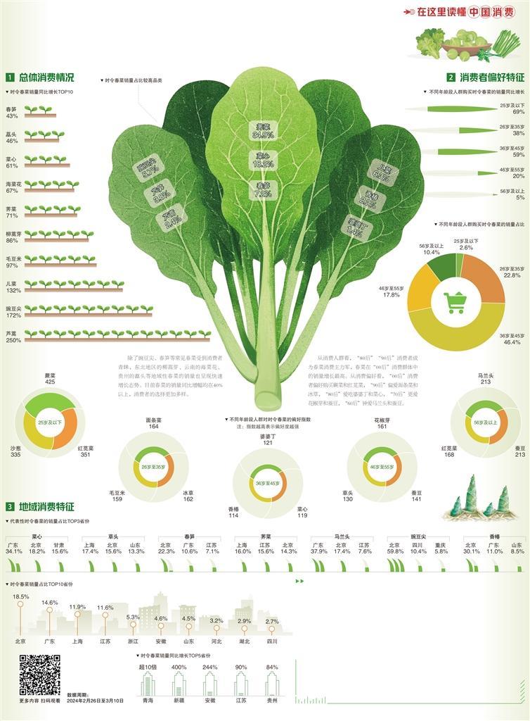 有趣的是,春菜消費也呈現出顯著(zhù)的地域偏好特征。上海消費者最?lèi)?ài)選購草頭、薺菜,酒香草頭、薺菜餛飩是春日餐桌上的心頭好;川渝消費者尤為鐘愛(ài)鮮嫩可口的豌豆尖和氣味獨特的折耳根;北京消費者最?lèi)?ài)香椿,同時(shí)春筍、蠶豆等也是餐桌上不可或缺的美味;廣東消費者最?lèi)?ài)的春菜當屬菜心;對于江浙地區的消費者而言,他們最喜歡選購春筍、馬蘭頭、薺菜、蘆筍等。