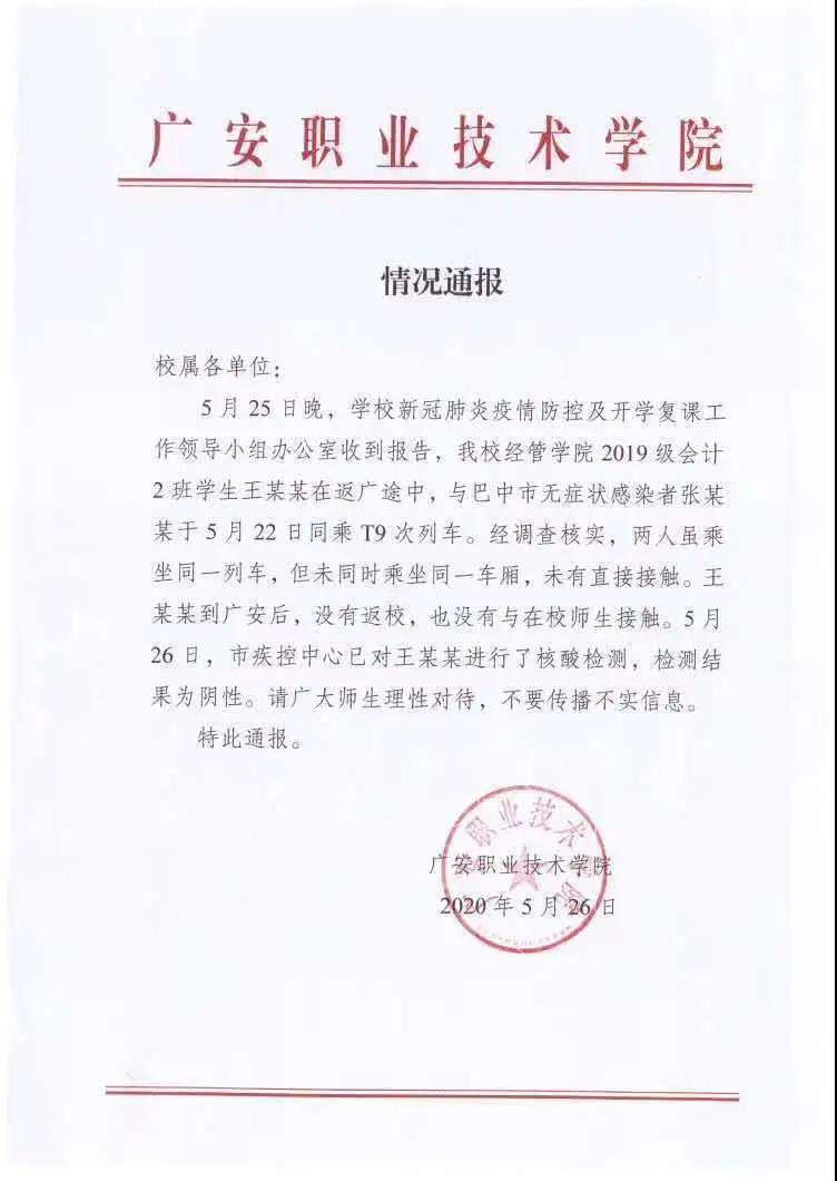 公告稱(chēng), 5月25日晚,廣安職業(yè)技術(shù)學(xué)院新冠肺炎疫情防控及開(kāi)學(xué)復課工作領(lǐng)導小組辦公室收到報告,該校經(jīng)管學(xué)院2019級會(huì )計2班學(xué)生王某某在返廣(安)途中,與巴中市無(wú)癥狀感染者張某某于5月22日同乘T9次列車(chē)。經(jīng)調查核實(shí),兩人雖乘坐同一列車(chē),但未同時(shí)乘坐同一車(chē)廂,未有直接接觸。王某某到廣安后,沒(méi)有返校,也沒(méi)有與在校師生接觸。5月26日,廣安市疾控中心對王某某進(jìn)行核酸檢測,檢測結果為陰性。