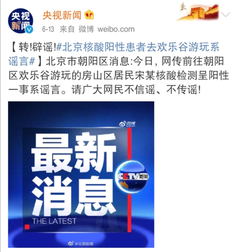 另?yè)兀央視新聞,針對“家住房山區的宋某在歡樂(lè )谷游玩時(shí)發(fā)現自己核酸檢測結果呈陽(yáng)性”一事,北京市朝陽(yáng)區對此表示,該信息是謠言。