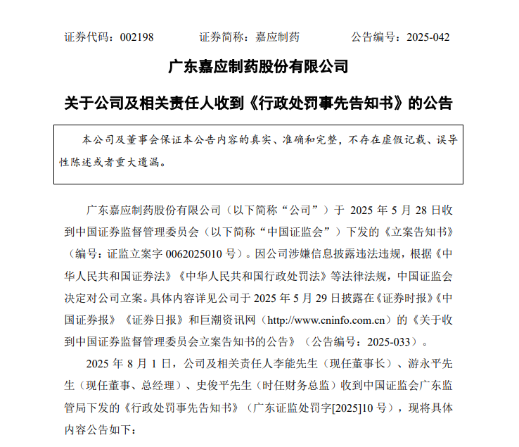 中國經(jīng)濟網(wǎng)北京8月5日訊(記者郭文培)8月4日,廣東嘉應制藥股份有限公司(以下簡(jiǎn)稱(chēng)嘉應制藥)披露公告,因2.2億元關(guān)聯(lián)資金拆借未及時(shí)披露,該公司及現任董事長(cháng)李能、現任董事兼總經(jīng)理游永平、時(shí)任財務(wù)總監史俊平收到中國證監會(huì )廣東監管局下發(fā)的《行政處罰事先告知書(shū)》,擬被處以共計490萬(wàn)元罰款。