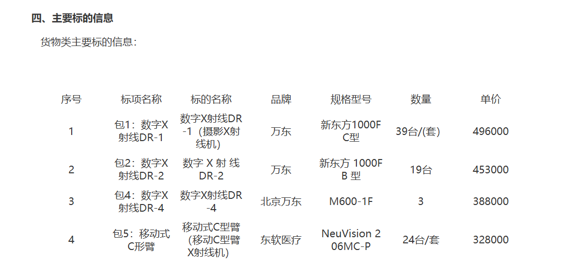 公告顯示,該項目為縣域醫共體醫療設備以舊換新項目,涉及山西省11個(gè)市的316家縣域醫療機構。項目共有5包,分別是數字X射線(xiàn)DR-1、數字X射線(xiàn)DR-2、數字X射線(xiàn)DR-3、數字X射線(xiàn)DR-4和移動(dòng)式C形臂。除數字X射線(xiàn)DR-3投標供應商數量不符合要求,系統自動(dòng)廢標外,國藥集團山西有限公司、山西省藥材醫療器械有限公司、重藥控股山西康美徠醫藥有限公司、國藥山西醫用器械有限公司中標其他四包,中標金額分別為19344000元、8607000元、1164000元、7872000元。其中,數字X射線(xiàn)DR為萬(wàn)東產(chǎn)品,移動(dòng)式C形臂為東軟醫療產(chǎn)品。