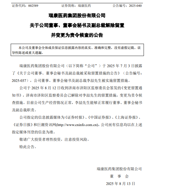 瑞康醫藥董秘李喆留置變更為責令候查