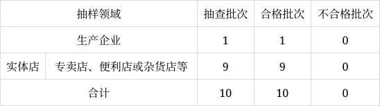 本次任務(wù)共10批次,實(shí)際抽到10批次,在生產(chǎn)企業(yè)和實(shí)體店中抽取,具體情況見(jiàn)表1。