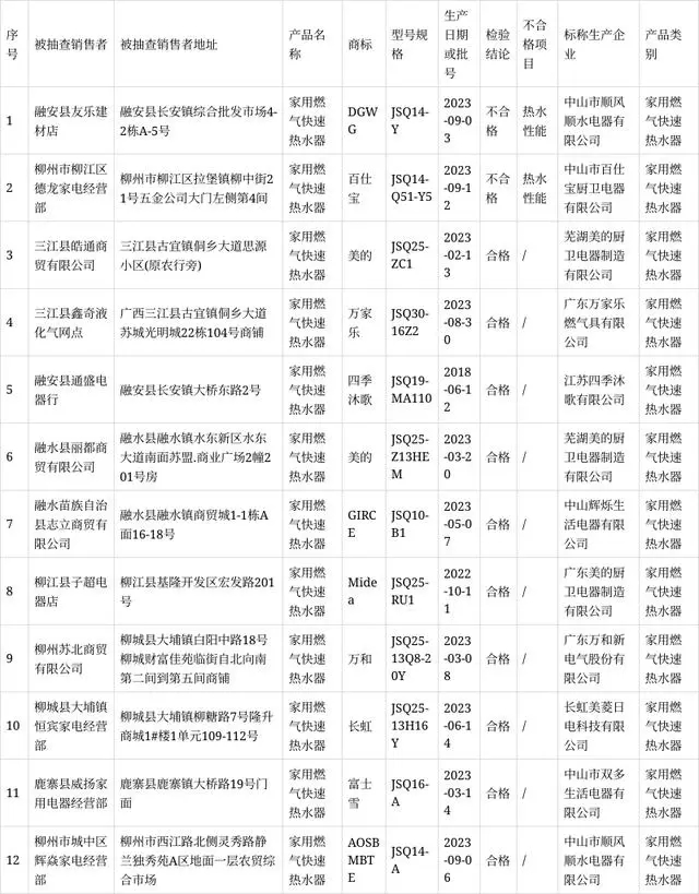 廣西柳州市市場(chǎng)監督管理局通報12批次家用燃氣快速熱水器產(chǎn)品監督抽查情況