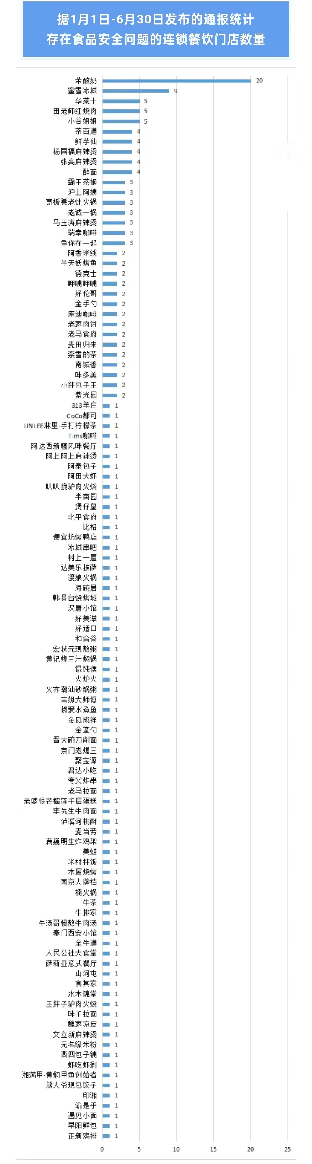 7月3日,北京市消費者協(xié)會(huì )公布今年1月1日至6月30日北京市市場(chǎng)監管系統食品安全大檢查結果。結果顯示,茉酸奶有20家門(mén)店存在食品安全問(wèn)題,蜜雪冰城有9家門(mén)店存在食品安全問(wèn)題,華萊士、田老師紅燒肉、小谷姐姐、茶百道、鮮芋仙、楊國福麻辣燙、張亮麻辣燙、醉面等發(fā)現存在食品安全問(wèn)題的門(mén)店數量分列3到10位。