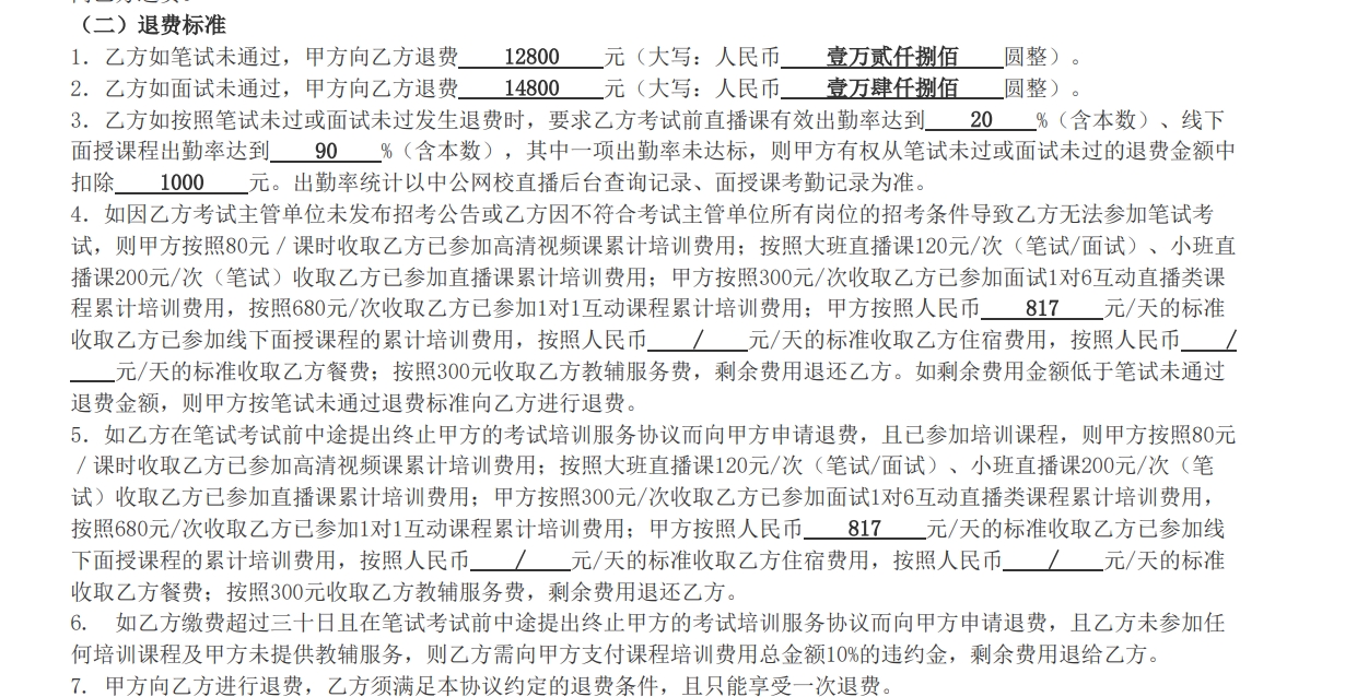 記者在武女士提供的其與中公教育簽訂的協(xié)議書(shū)里看到,符合出勤率等其他條件后,如果筆試或面試未通過(guò),中公教育將為學(xué)員全額退款。學(xué)員需在規定時(shí)間內提交相關(guān)材料申請退費,中公教育核實(shí)所提交材料真實(shí)、符合退費條件后,在30至45個(gè)工作日內將約定的退費金額支付至學(xué)員提供的銀行賬戶(hù)。