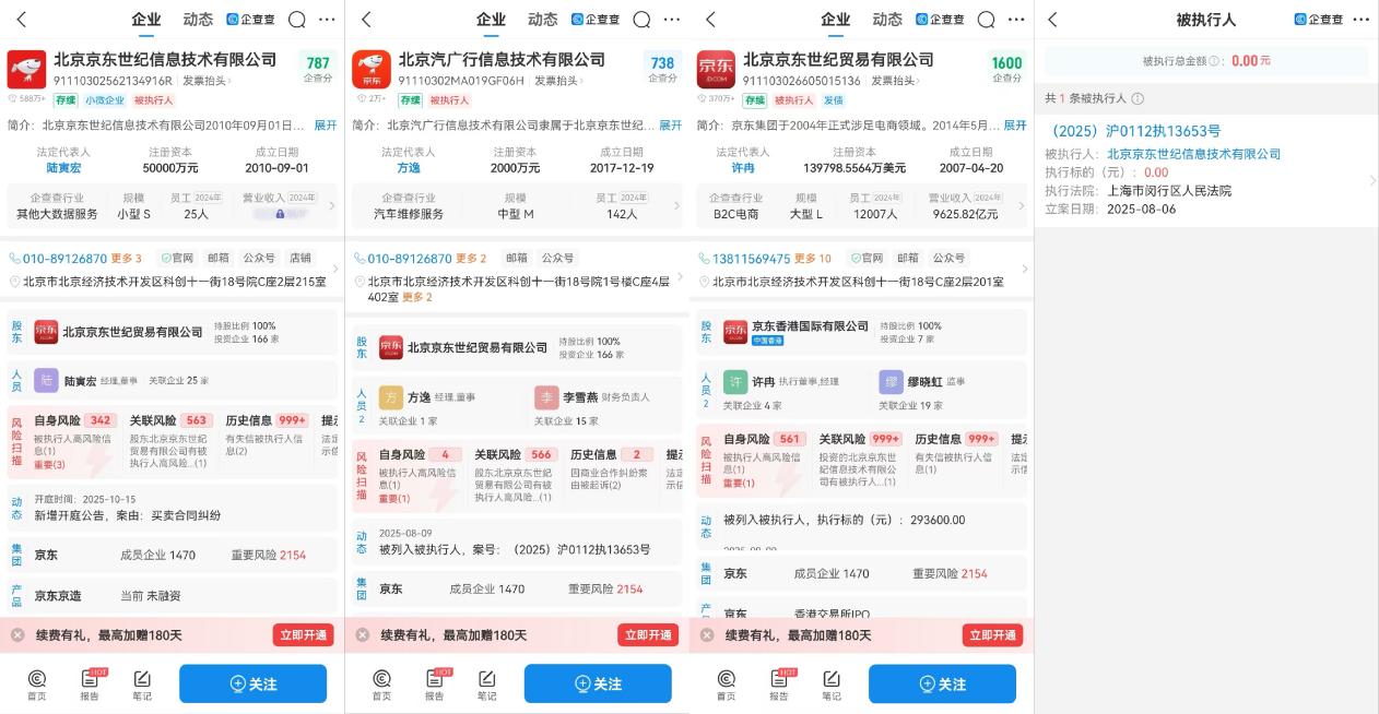 2025年8月4日,京東養車(chē)在官方微信等渠道發(fā)布聲明稱(chēng),“‘震虎價(jià)’宣傳活動(dòng)中的相關(guān)行為構成不正當競爭,現特此聲明,以消除影響?!逼蟛椴椴樵?xún)結果顯示,京東養車(chē)的三家關(guān)聯(lián)公司(亦即京東養車(chē)不正當競爭糾紛案的三家被告),因未履行完畢生效判決,已經(jīng)于2025年8月6日被列為“被執行人”,而點(diǎn)進(jìn)“被執行人”發(fā)現,執行標的為0元,執行法院為上海市閔行區人民法院。