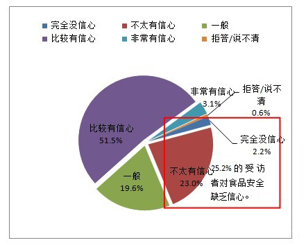 雖然,今年市民對食品安全比較有信心,但是食品安全問(wèn)題現狀仍不可忽視,其中25.2%的市民對食品安全缺乏信心,51.5%的市民比較有信心,僅3.1%的市民非常有信心。