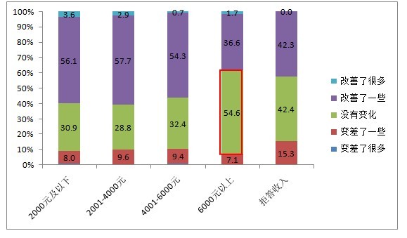 收入水平在6000元以上的市民,認為過(guò)去一年食品安全沒(méi)有改善的人數遠大于認為有所改善的人數!