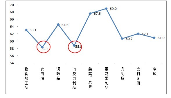 進(jìn)一步分析發(fā)現,6000元以上高收入人群對食用油、肉及肉制品這兩類(lèi)食品的安全信心指數最低,直接影響了對食品安全現狀整體的信任度。