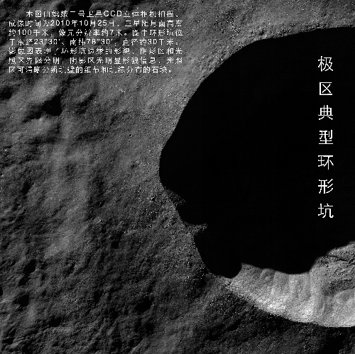 北京,2010年11月8日 國家國防科技工業(yè)局首次發(fā)布嫦娥二號月面虹灣局部影像圖 這是極區典型環(huán)形坑(成像時(shí)間為10月25日)。